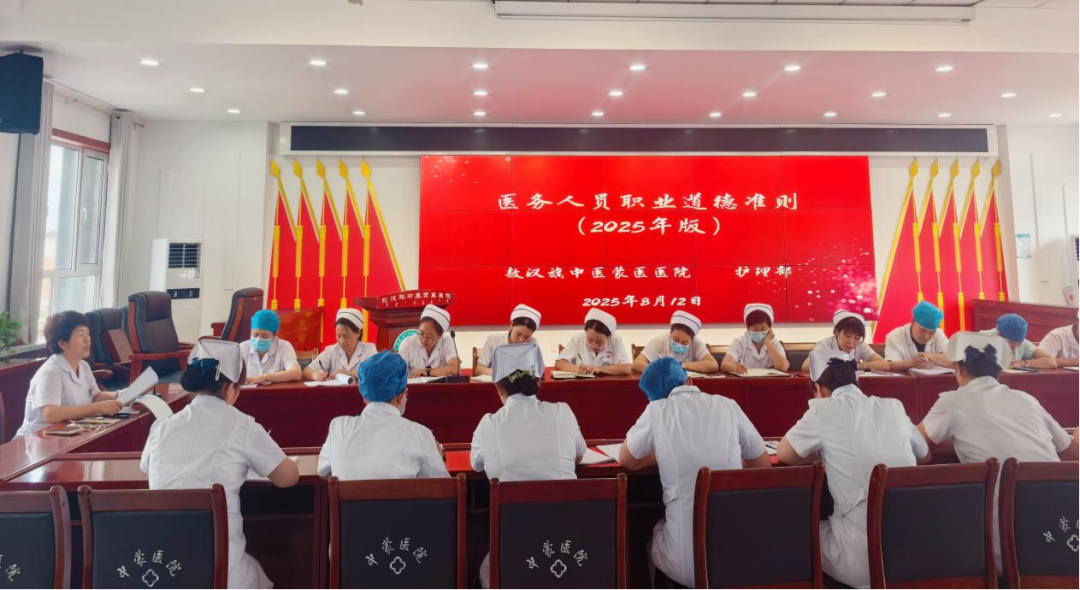 德廉教育,思想筑基。为深入贯彻《医务人员职业道德准则(2025年版)》要求,将“以德为先,向廉而行”融入护理管理,强化护理管理队伍的职业道德素养与领导力,我院护理部于8月12日组织全院护士长开展专题学习活动,从思想建设、制度约束、行为实践三个维度,落实与筑牢护理队伍的思想防线。